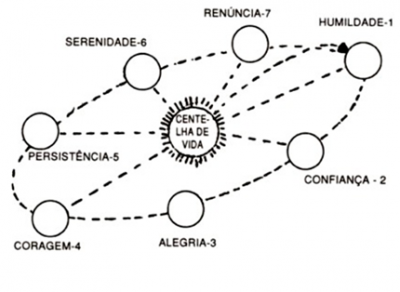 Com os indivíduos sucede algo semelhante. Possuem uma Centelha de Vida a funcionar como o centro do sistema espiritual que constituem. Dessa Centelha, que recebe a energia magnética da Força Central da Vida ou Deus, desprendem-se as “formações planetárias” representadas pelas virtudes, as quais, por sua vez, evoluem do estado primitivo ao apogeu de um desenvolvimento completo. São elas a Humildade, a Confiança, a Alegria, a Coragem, a Serenidade, a Persistência e a Renúncia. Recebendo, através da Centelha de Vida, a força vital, elas se aprimoram, influenciando-se mutuamente.