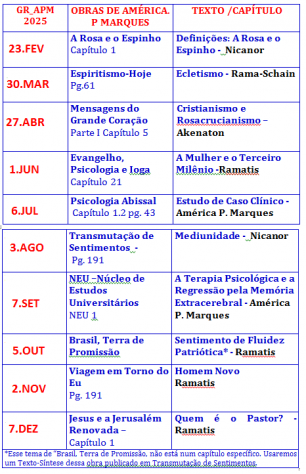 Cada mês, será estudado um texto diferente, de cada uma das obras da médium e pesquisadora psíquica América Paoliello Marques, realizaremos a partilha e compartilhamento de experiências e reflexões, a partir do que a leitura dos textos (individual e grupal) promoveu em nós. A proposta é que essas reflexões e trocas aprofundem e inspirem nosso autoconhecimento, autotransformação e evolução espiritual.